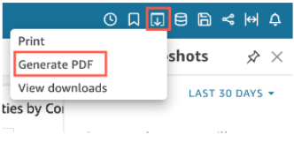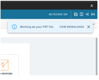 - QuickSight will begin preparing the dashboard report for download as soon as you choose to Generate PDF. Open the Downloads pane on the right by selecting View Downloads in the blue pop-up.
