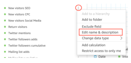 - In the Fields pane on the data preparation page, click the three-dot icon next to the field you wish to modify. Then, select Edit name & description.