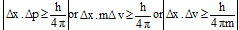 The uncertainity in measurement of position, x, and the uncertainity in momentum p or m Δ v, are related by Heisenberg’s relationship as: (p = mv, Δp=m Δ v)