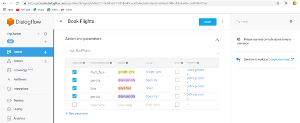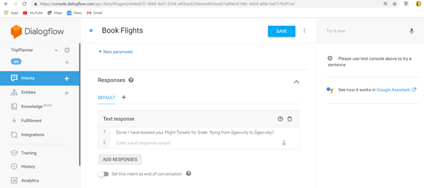 Here, I have taken Book Flights-Room as Follow up Intent. This will help User to give the Information only once. If the User Book Flight Tickets using this Bot, he also wants to book a room, he does not need to give the whole information again and again. This Follow up Intent books room directly.