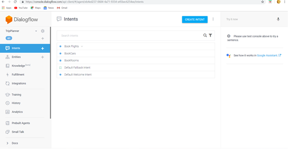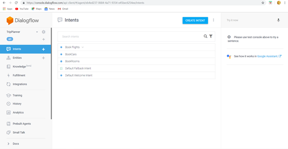 In our Trip Planner, bot have to book Flight Tickets, book Rooms, book Car. So, these are required Intents for our Bot. As discussed above many Intents can be created in an Agent Trip Planner. By clicking on Create Intent option, we can create an Intent.