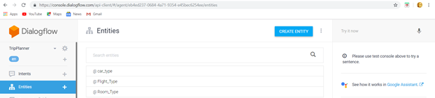 Here, For Trip Planner Agent, we require different Entities such as Flight Type, Room Type, Car Type which are not default. Entities like City, Date, Time are default ones which need not to be created.