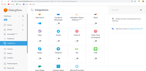 DialogFlow integrates with many conversation platforms such as Facebook Messenger, Slack, Viber, Twitter, Twilio, Skype, Telegram, Kik, Line, Cisco Spark, Amazon Alexa, Microsoft Cortana. These Integrations provide Platform specific features for building Responses.