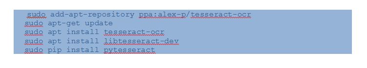 For the Ubuntu 14.04, 16.04, 17.04, 17.10. For 18.04 you can skip the first 2 commands.for more details about the tessaract just follow the link. https://www.pyimagesearch.com/2017/07/10/using-tesseract-ocr-python/