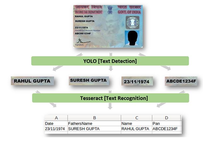 Let’s observe the above diagram , from that we can understands that the image of pan card is passed to YOLO detector , then the YOLO detects the required text regions and crops that text and take out from the image. Next we can pass those texts one by one to tessaract engine and the tessaract engine reads the text and stores that information. And you can show your results in any form of choice like excel etc… You need to install the darknet by using the following code.