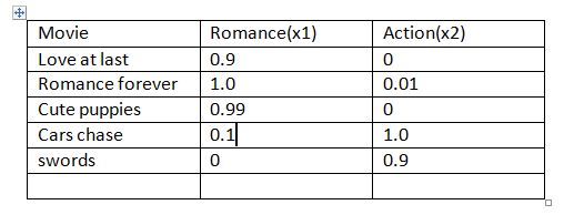 If we observe the rating table first two users gave high rating to the romantic movies, whereas other two are quite opposite they gave high rating to the action movies. So, the problem statement for recommender system is given these table of r(i,j) and y(i,j) we have to compute the rating of the movies that are not seen by the users(-) and based on that rating we have to suggest the best movie to the user. So, our task is to build a recommender system to come up with a learning algorithm that can automatically fill the missing values and based on them we can recommend user what else he might be interested to watch. Let’s say for each movie we have set of features as shown below. In particular where ‘x1’ measures the degree to which a movie is romantic movie and ‘x2’ measures the degree to which a movie belongs to action genre.