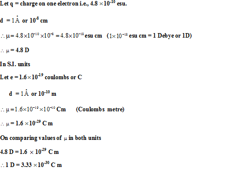 For example , dipole moment of HCl is 1.03 10-18 esu – cm and is expressed as 1.03 D.