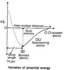 Therefore , the H atoms constitute a stable grouping called hydrogen molecule. The critical distance r0 corresponding to minimum energy is called bond length. Experiments have shown that the value of r0 is 74 pm. The energy corresponding to the minimum in the curve is called bond energy/enthalpy.