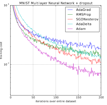 Adam (Adaptive Moment Estimation) works with momentums of first and second order. The intuition behind the Adam is that we don’t want to roll so fast just because we can jump over the minimum, we want to decrease the velocity a little bit for a careful search. In addition to storing an exponentially decaying average of past squared gradients like AdaDelta, Adam also keeps an exponentially decaying average of past gradients M(t).