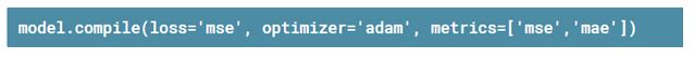 The mean_squared_error (mse) and mean_absolute_error (mae) are our loss functions – i.e. an estimate of how accurate the neural network is in predicting the test data. We can see that with the validation_split set to 0.2, 80% of the training data is used to test the model, while the remaining 20% is used for testing purposes.