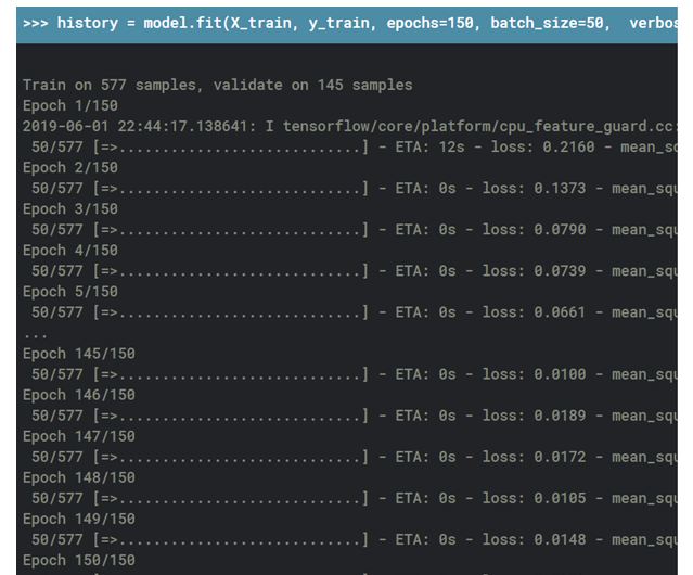 Here, we can see that keras is calculating both the training loss and validation loss, i.e. the deviation between the predicted y and actual y as measured by the mean squared error.