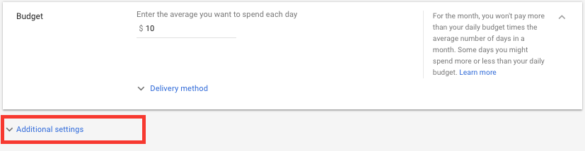 When you have set up your delivery method and budget, click the “Additional Settings” drop-down.