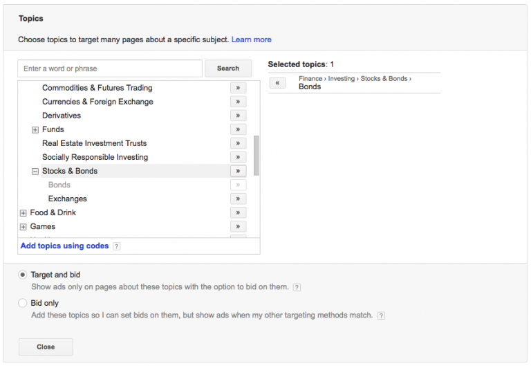 For instance, for a bond promoting customer, you’d need to target individuals in the class Finance > Investing > Stocks and Bonds > Bonds.