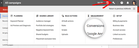 Sign into your Google AdWords account. In the upper right corner, tap the torque symbol, and after that, click Conversions under Measurement.