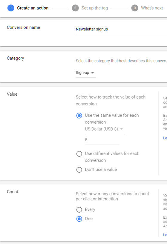 Determine a fitting conversion name and pick the correct classification from the dropdown. You’ll likewise need to indicate the conversion esteem and tallies per your necessities.