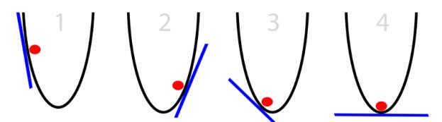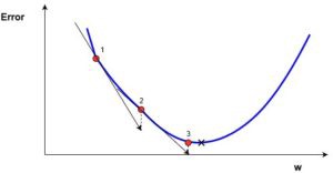 We got the above equation which depicts what is the change in cost function with change in model parameters.let’s assume initial weights and bias are selected randomly so we got the cost function at a point “1” some where on the parabolic curve as shown in below figure. Which are not an optimum values of parameters. In order to get minimum cost function we have to move to local minimum fig(4)