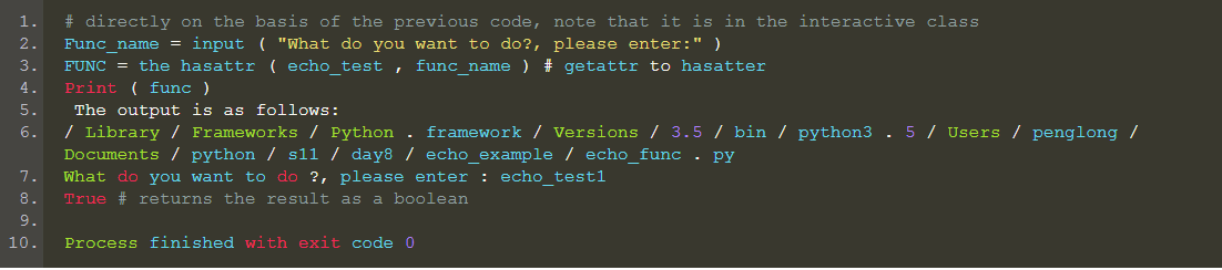 It is also the most important function of reflection in python. The role of hasatter is more for the getattr service. Just like in the above code, it is possible that the data entered by the user does not have a matching function name in our defined function, and it cannot be executed. If there is no error defense mechanism, the program will crash, so get the data input by the user, before going directly to find the execution, you need to first determine whether the function that the user wants to execute exists. This is the function of hasattr. The code is as follows: