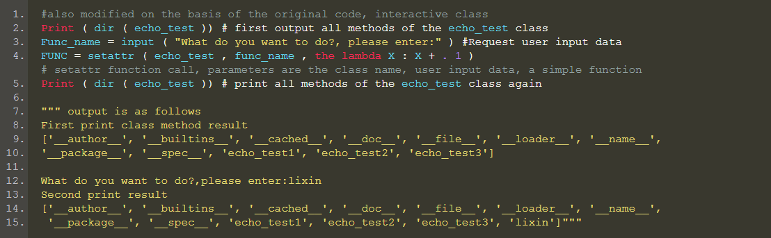 In the process of use, it is also necessary to dynamically obtain the class name. The class names in all the above codes are all fixed input. In actual use, this will make the code extremely inflexible. The first argument of the four reflection functions accepts only the class name and cannot receive the string. The data directly input by the user is obviously a string and cannot be used directly. Of course, we can convert strings to class names, but it doesn’t have to be that much trouble. Python has a corresponding response, the code is as follows: