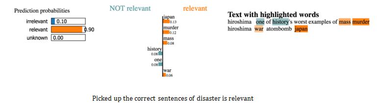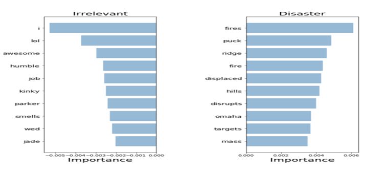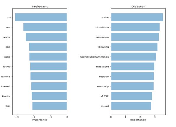For validating of our model and its predictions you need to know which words are using to make the decisions. If our data is biased it will give the high accuracy and make the accurate predictions in sample data, bur in real world our model would not generalize well and plot the most important words for both irrelevant and disaster class. The bag of words and logistic regression we can plot the most important words easily then we can extract the coefficients. These coefficients are used for our predictions.