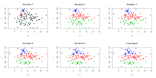 - Iterate the process until there is no change to the centroids. That is assignment of data points to clusters isn’t changing.