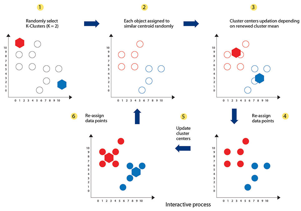 To process the learning data, the K-means algorithm in data mining starts with a first group of centroids that are randomly selected, which are used as the beginning points for every cluster, and then performs iterative or repetitive calculations to optimize or improve the positions of the centroids.