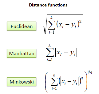 Here when the value of q is set to 1, Minkowski formula is the same as Manhattan distance, and when set to two, it changes to Euclidean distance measure.