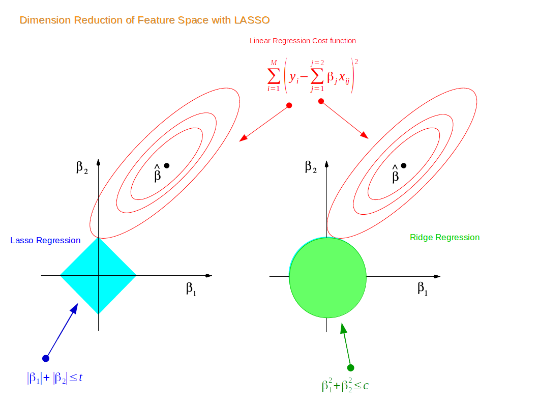 For lasso, the equation becomes, |β1|+|β2|≤ s. This implies that lasso coefficients have the smallest RSS (loss function) for all points that lie within the diamond given by |β1|+|β2|≤ s.