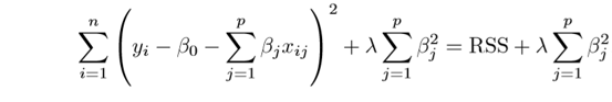 where the RSS is modified by adding the shrinkage quantity. The coefficients are now estimated by minimizing this function. Here, λ is the tuning parameter which decides penalization the flexibility of our model. The increase in flexibility of a model is represented by increase in its coefficients, to minimize the above function, then these coefficients need to be small. This is how the Ridge regression technique prevents coefficients from rising too high. β0 intercept is a measure of the mean value of the response when xi1 = xi2 = …= xip = 0 which cannot be shrinked.