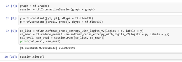 Here the predicted values are pass to the before softmax as the tensorflow functions and calculate the softmax and cross-entropy. And observe the loss function it is a single element and observe the loss and mean of cross-entropy.