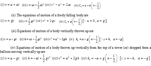 (i) Consider a body moving with uniform acceleration ‘a’. Its initial and final velocities are denoted by ‘u’ and ‘v’ respectively. It undergoes a displacement ‘s’ in a time interval ‘t’. Its displacement in a particular nth second is Sn. The relations connecting the above kinematic quantities are called equations of motion, which are mentioned below,