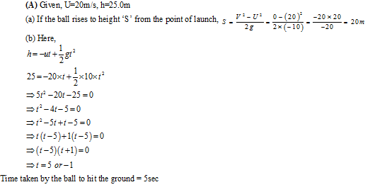A ball is thrown vertically upwards with a velocity of 20ms-1 from the top of a multistory building. The height of the point from where the ball is thrown is 25.0m from the ground. (a) How high will the ball rise? And (b) How long will it be before the ball hits the ground? (Take g= 10ms-2)