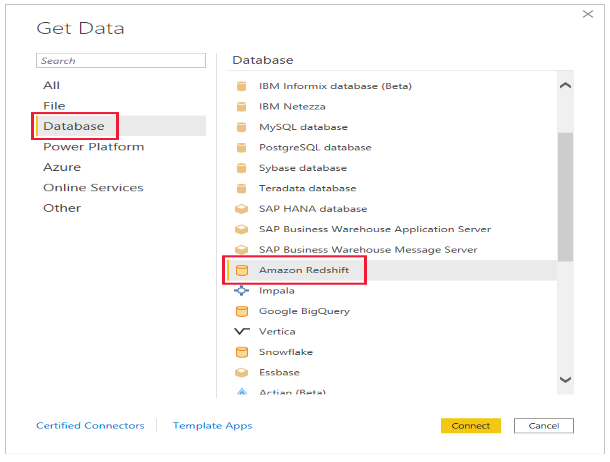 Power BI Desktop connects to Amazon Redshift databases via the Get data ribbon. From the left-hand menu, select Database. Amazon Redshift appears.