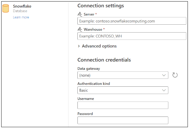 - Enter the required information to connect to Snowflake, including the server name, and the name of your Snowflake computing warehouse in Warehouse.