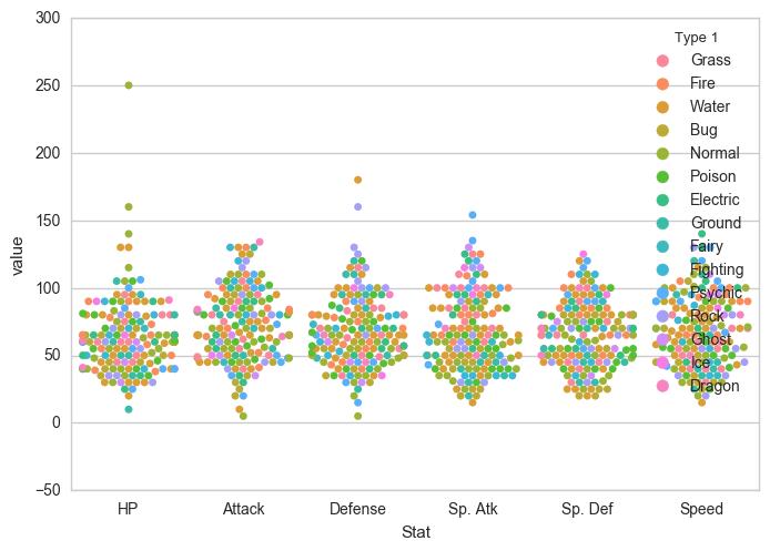 2 sns.swarmplot(x=’Stat’, y=’value’, data=melted_df,