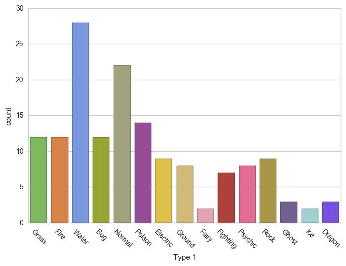2 sns.countplot(x=’Type 1′, data=df, palette=pkmn_type_colors)