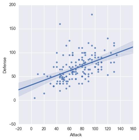 2 sns.lmplot(x=’Attack’, y=’Defense’, data=df,