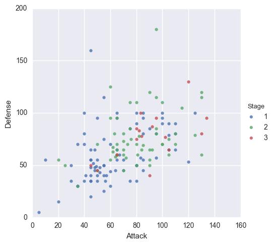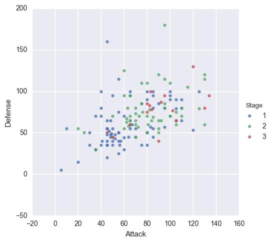 2. Then, we’ll set hue=’Stage’to color our points by the Pokémon’s evolution stage. This hueargument is very useful because it allows you to express a third dimension of information using color.