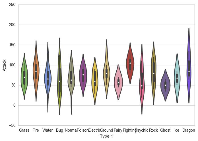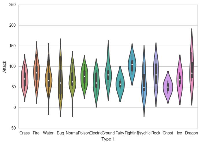 5 sns.violinplot(x=’Type 1′, y=’Attack’, data=df)