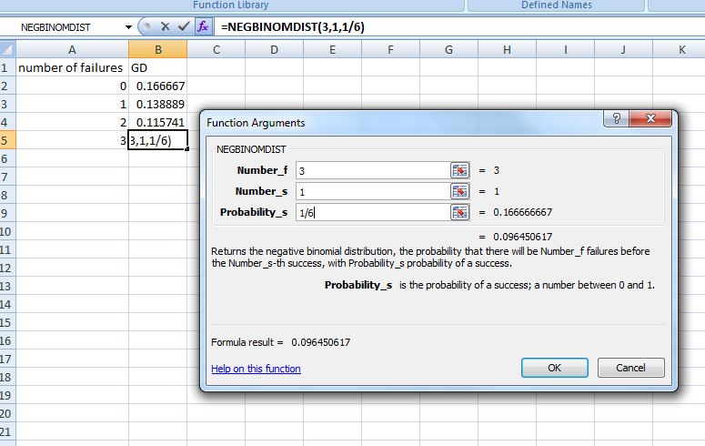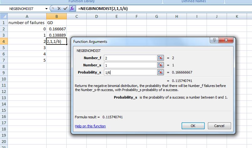 In Excel, we use the function NEGBINOMDIST(number_f, number_s, probability_s) where