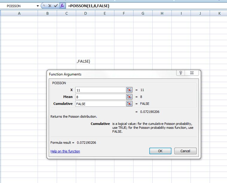 Let us solve this example in Excel using the function, POISSON(x,mean,cumulative)