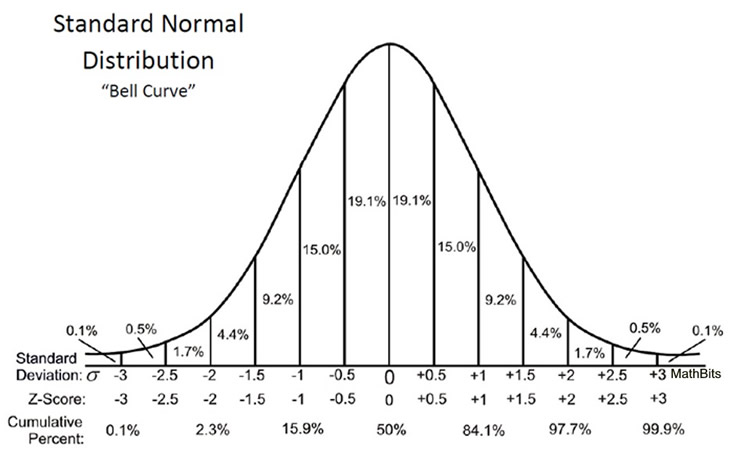 - 7% fall between -3 and 3 (within 3 standard deviations of the mean).