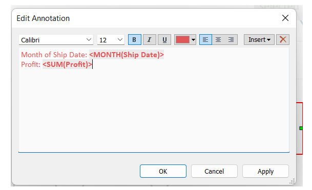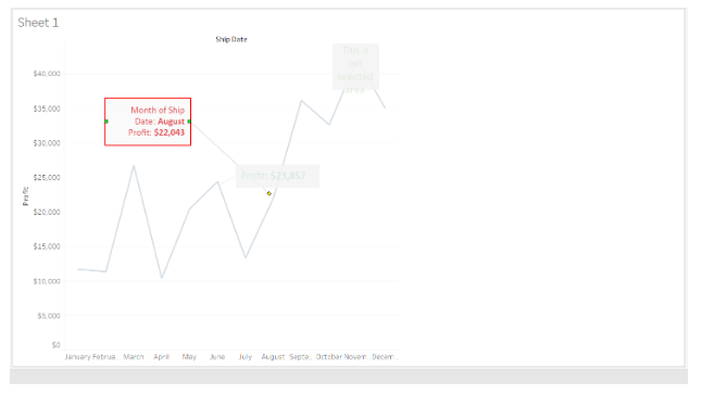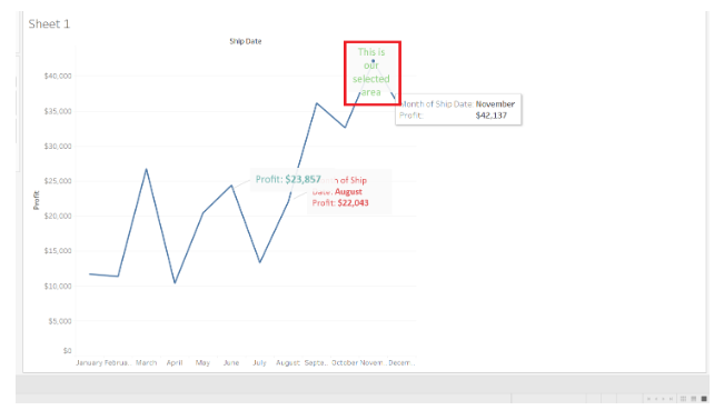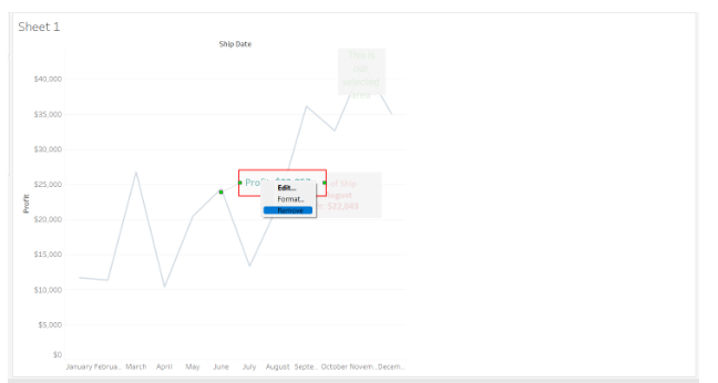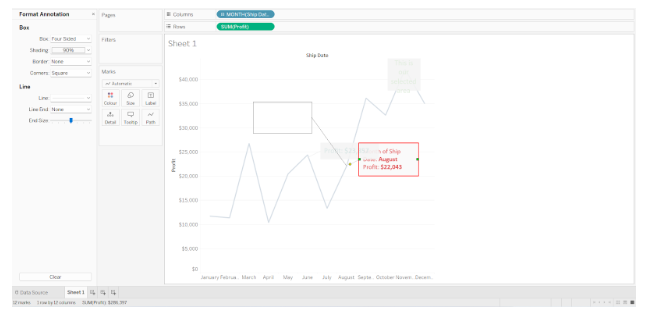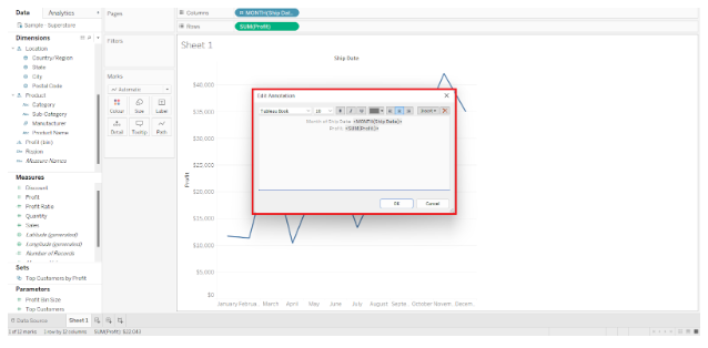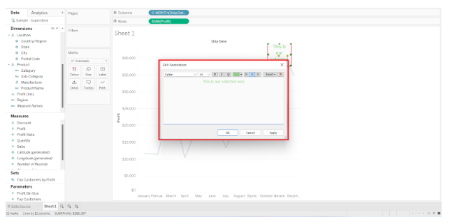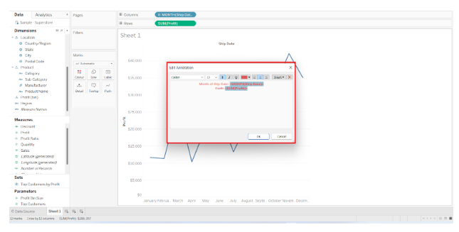 Using Tableau Annotations, we created an Area Chart by dragging Profit to the Rows Shelf and Ship date Month to the Columns Shelf.