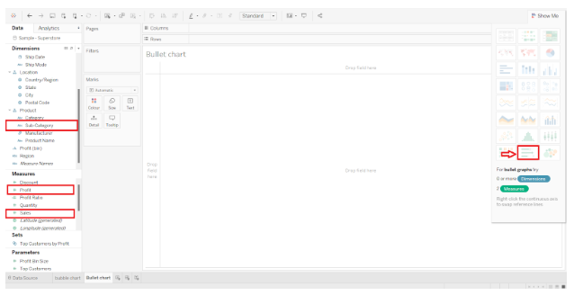 Step 1: Create a blank/new sheet in your Tableau workbook with your dataset uploaded. From the list of fields, we select one dimension field; Subcategory, and two measure fields; Profit and Sales. We then select the bullet graph option from the visualization pane. To access the visualization pane, click on Show Me.
