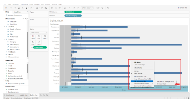 Step 4: The reference line is now edited to include percentage-wise segments of average profit values. We do this by right-clicking on the Sales axis and selecting Edit Reference Line. We then select 60%, 80% of the average profit.