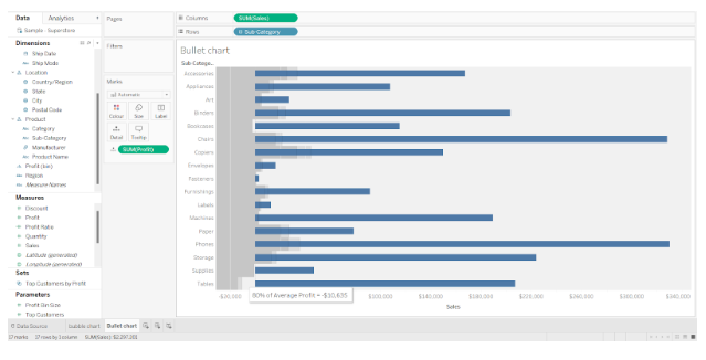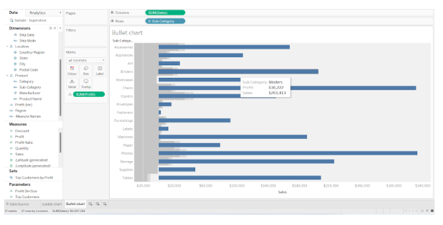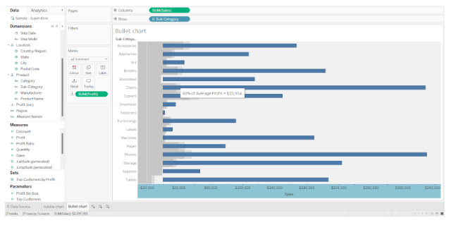 Step 5:This concludes our final bullet chart showing sales and profit values for each subcategory. You’ll see more information about the individual bars when you hover over them, such as the sub-category name, profit value, and sales value.