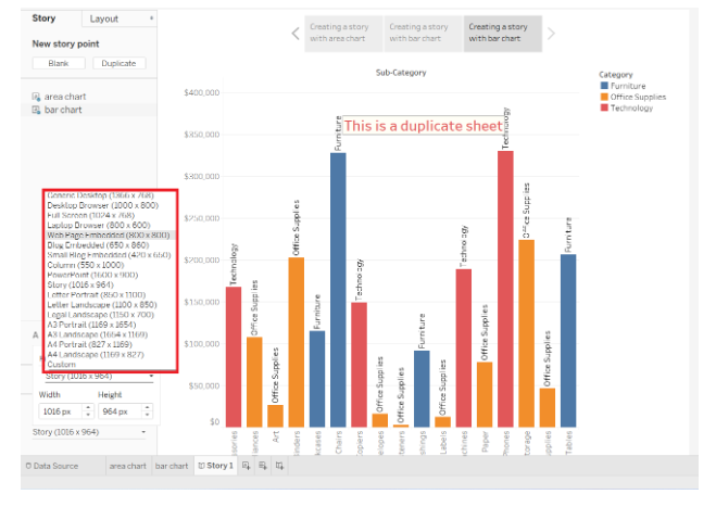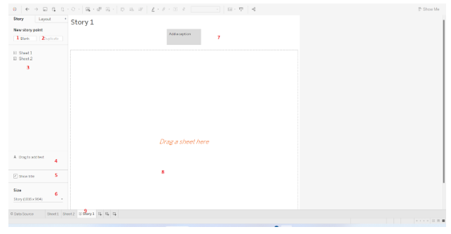 Tableau selects the Fixed-size with Story, Size option by default. Under Size, you can adjust the size to suit your needs. You may find it useful to design your story in accordance with the size. The automatic option will adjust the point according to the size of the screen.