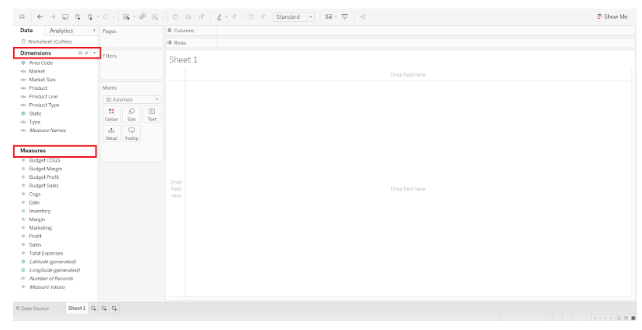 Step 3: Start a new worksheet. Tableau displays a variety of charts in the top right corner. One of these is the Text Table, also known as CrossTab. A text table requires one or more dimensions and one or more measures, as indicated in the box.