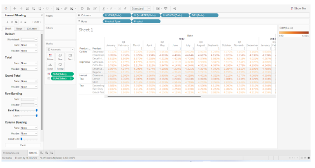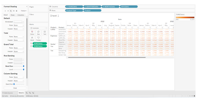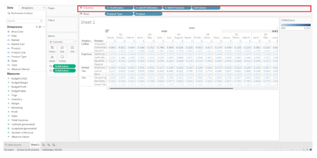By adding colors to the measures, you can make the chart even more attractive and informative. Drag and drop the Measure “Sales” into the color Mark card to color-code your values.