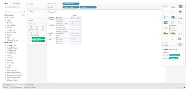 • Form Hierarchy: Spend the first few minutes simply reviewing the data and attempting to form hierarchies. In the case of Coffee File Data, the product type and product can be arranged in a hierarchical manner. Additionally, Market Size, Market, State, and Area Code can be used for another hierarchy of data