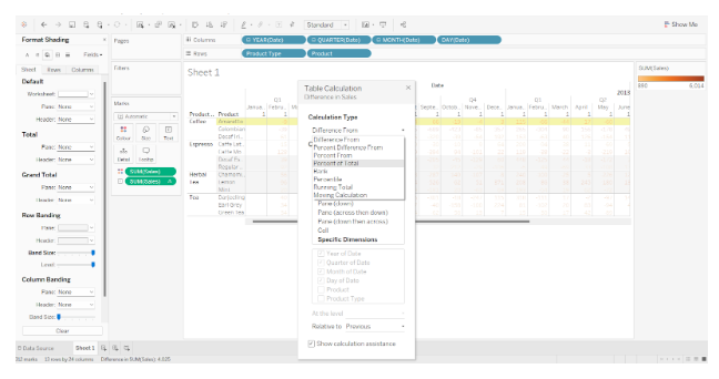 3. Select “Percent of total” as the calculation type, and then select the Table(down) option from the drop-down menu under “compute using the field”.